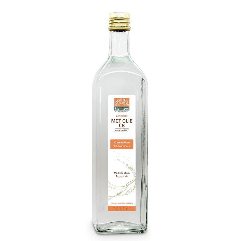 MCT C8 от кокос, Mattisson Healthstyle е чисто масло, произведено от 100% кокосово масло, съдържащо 99% каприлова киселина (C8). Силно концентрирана форма на средноверижни триглицериди. Маслото C8 MCT е създадено като високоефективна форма на MCT, която се метаболизира бързо, преобразувайки се в кетонни тела само за няколко минути след прием. Осигурява незабавна енергия. Отлично допълнение за спортисти и хора с активен начин на живот. Маслото има неутрален вкус и е подходящо както за студено, така и за топло приложение до 177°C.