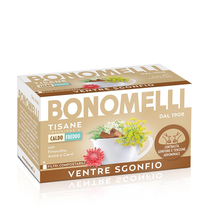 Билковият чай на италианската компания Bonomelli e напълно натурален продукт, който подпомага храносмилателните процеси и намалява образуването на газове и усещането за тежест и подуването на корема.