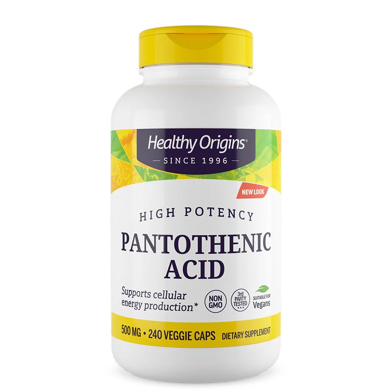 Pantothenic Acid High Potency на американската фирма Healthy Origins съдържа висока доза пантотенова киселина под формата на D-калциев пантотенат. Играе ключова роля в производството на коензим A, който участва в множество метаболитни процеси, включително разграждането на въглехидрати, мазнини и протеини. Допринася за нормалната функция на нервната система, подпомага синтеза на невротрансмитери и хормони и оказва благоприятно въздействие върху енергийния баланс. Освен това допринася за нормалната дейност на сърдечно-съдовата система, подпомага образуването на червени кръвни клетки, спомага за намаляване на умората и отпадналостта и поддържа здравето на кожата и косата.