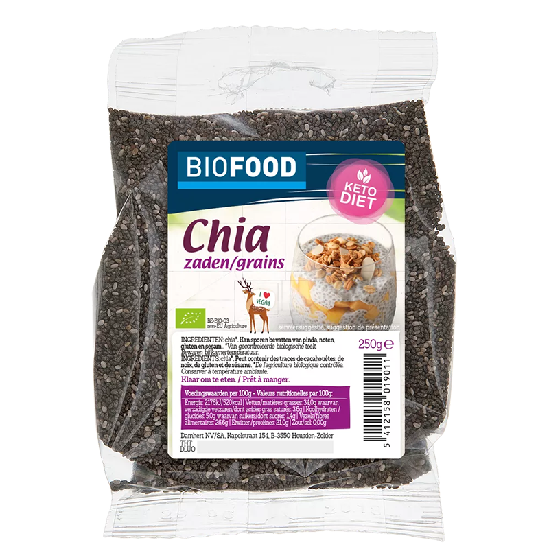 Biofood Chiazaden BIO / Чия (семена), БИО 250 грама е здравословен продукт на белгийската компания Damhert. Съдържа 100% органични семена от чия (Salvia hispanica), отгледани при контролирани условия на био земеделие. Продуктът е специално предназначен за хора, които търсят висококачествени натурални източници на ценни хранителни вещества. Продуктът е без добавени консерванти, оцветители и изкуствени вещества, което го прави отличен избор за вегани, хора с непоносимост към лактоза или тези, които избягват соята.