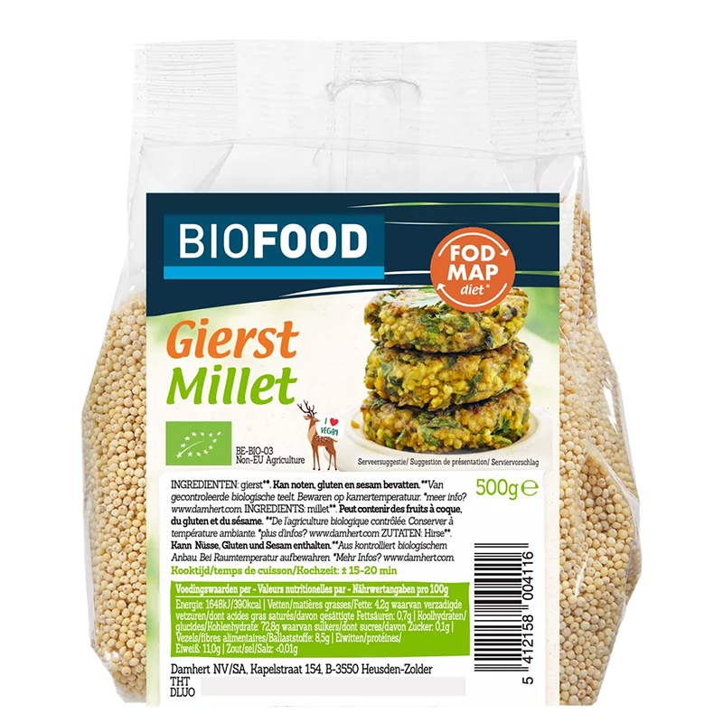 Gierst BIO / Просо, БИО, 500 грама е здравословен продукт, произведен от белгийската компания Damhert. Просото е зърнена култура, известна с високото си съдържание на хранителни вещества и лесната си усвояемост от организма. Опаковката съдържа 500 грама просо, произведено от контролирано биоземеделие, което гарантира отсъствието на вредни химикали и пестициди.