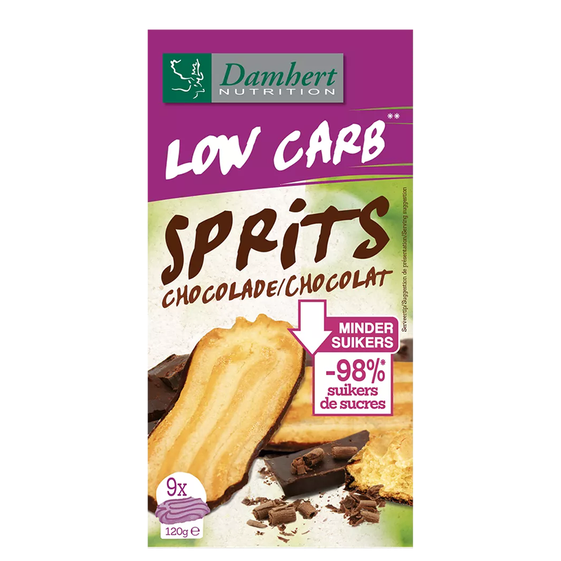Low Carb Sprits Chocolade / Маслени бисквити с шоколад, с ниско съдържание на въглехидрати (без захар), 120 грама е здравословен продукт на белгийската компания Damhert. Представяме ви вкусна и нежна комбинация от маслени бисквити с шоколад, специално създадени за хора, които искат да се наслаждават на сладки изкушения, без да нарушават диетичния си режим.