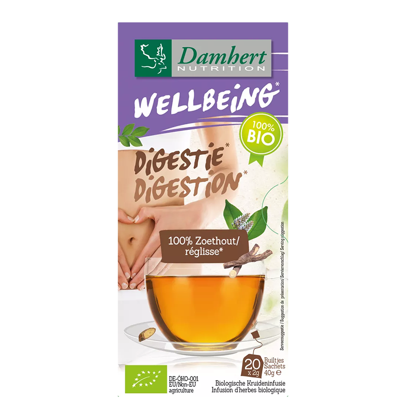 Wellbeing Digestie / Чай за храносмилане (женско биле) БИО, 20 филтърни пакетчета е продукт на белгийската компания Damhert. Този висококачествен, натурален билков чай е предназначен за подпомагане на храносмилателната система. Основната му съставка е 100% сух корен от женско биле (Glycyrrhiza glabra), добит от биологично земеделие, което гарантира чистотата и високото качество на продукта. Произведен от компанията Damhert в Белгия, този чай е създаден, за да осигури облекчение и подкрепа на храносмилателния тракт, като същевременно носи наслада от приятния му сладък вкус.