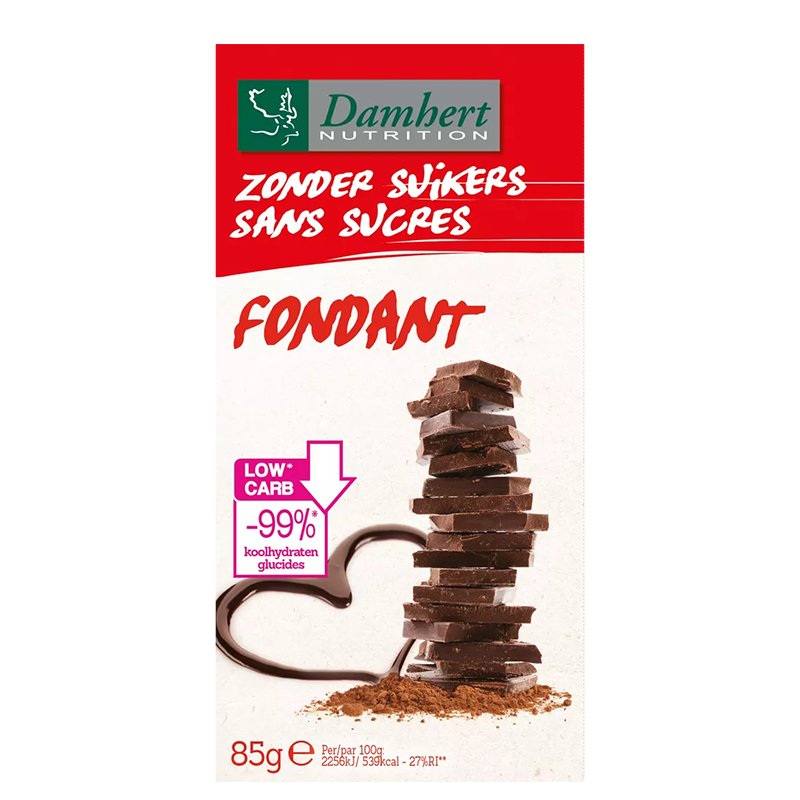 Zonder Suikers sans sucres Chocoladetablet Fondant / Черен шоколад (без захар), с ниско съдържание на въглехидрати, 85 грама е здравословен продукт, произведен от белгийската компания Damhert. Този изискан черен шоколад без захар е предназначен за всички ценители на висококачествените шоколадови изделия. Този шоколад се отличава с минимално съдържание на какао от 45,9%, което гарантира наситен и плътен вкус.