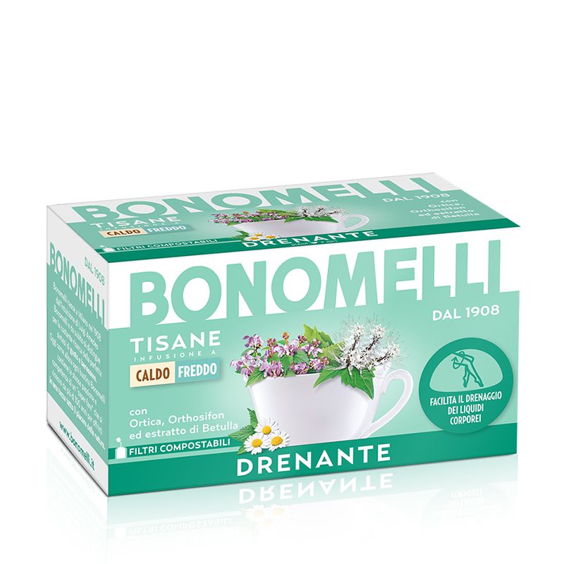 Tisane Drenante на италианската компания Bonomelli е висококачествена билкова смес, която съдържа в състава си екстракт от листата на бреза и коприва, лайка, лист ортосифон, вербена и дехидратиран ябълков сок. Има антиоксидантни, противовъзпалителни и диуретични свойства. Насърчава естествената детоксикация на организма и спомага за отвеждането на вредните вещества, токсините и излишната вода от тялото.